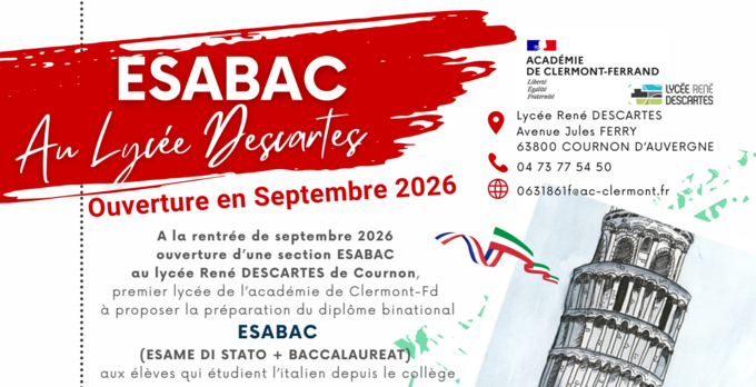 Par admin rene-descartes-cournon, publié le mercredi 25 février 2026 16:06 - Mis à jour le mercredi 25 février 2026 16:06Premier lycée de l'académie de Clermont-Fd à proposer la préparation du diplôme binational ESABAC (Esame di stato + Baccalauréat) aux élèves qui étudient l'italien depuis le collège. -
